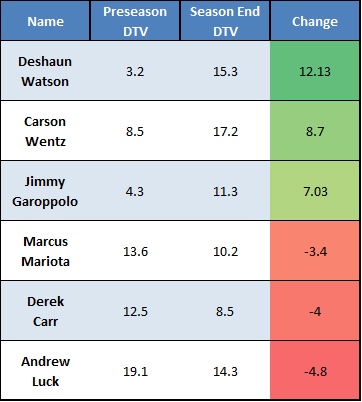 Understanding and projecting player value is a key factor in dynasty fantasy football. Keeping ahead of a player’s constantly fluctuating value, whether the shift is positive or negative, can promote rapid team improvement and success. Included below are the biggest risers and fallers in Dynasty Trade Value (DTV) over the 2017 NFL season at the quarterback position. Additionally, it includes brief analysis on what prompted the changes in value, as well as some brief thoughts on what to expect from each quarterback moving forward. Unless otherwise specified, all Dynasty Trade Values are based on a 12-team PPR league.