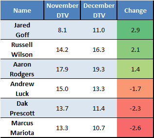 Understanding and projecting player value is a key factor in dynasty fantasy football. Keeping ahead of a player’s constantly fluctuating value, whether the shift is positive or negative, can promote rapid team improvement and success. Included below are the biggest risers and fallers in Dynasty Trade Value (DTV) over the last month at the quarterback position. Additionally, it includes brief analysis on what prompted the changes in value, as well as some brief thoughts on what to expect from each quarterback moving forward. Unless otherwise specified, all DTVs are based on a 12-team PPR league format.