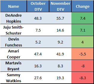 Understanding and projecting player value is a key factor in dynasty fantasy football. Keeping ahead of a player’s constantly fluctuating value, whether the shift is positive or negative, can promote rapid team improvement and success. Included below are the biggest risers and fallers in Dynasty Trade Value (DTV) over the last month at the wide receiver position. Additionally, it includes brief analysis on what prompted the changes in value, as well as some brief thoughts on what to expect from each wide receiver moving forward. Unless otherwise specified, all DTVs are based on a 12-team PPR league format.